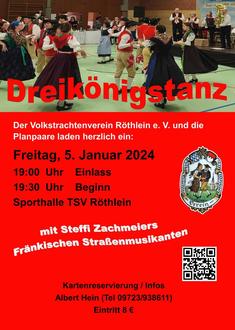 Am Vorabend von Dreikönig, am 05.01.2024, findet auch in 2024 wieder der Dreikönigstanz statt. Steffi Zachmeiers Fränkische Straßenmusikanten werden den Abend musikalisch begleiten. Die Figurentänze werden vorgetanzt, sodass jeder mittanzen kann. Natürlich wird es auch Plantouren geben.