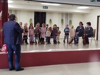 Mit dem Auftritt der Kindergartenkinder begann hier ebenfalls nach einer kurzen Begrüßung des 1. Bürgermeisters das Programm. Da das erste Adventswochenende bevorstand sangen die Kinder Weihnachts- und Nikolauslieder, deren Texte alle kannten und viele klatschten und sangen mit. Danach ließen sich alle den Kaffee und die verschiedenen Blechkuchen und Torten der Konditorei Müller schmecken. Nach den besinnlichen Worten von Pfarrer Schimmer sorgte Ewald Hofmann für die musikalische Unterhaltung mit Schifferklavier, Keyboard, Gesang und vielen Stücken, die jeder kennt. Es wurde geschunkelt, mitgesungen und das ein oder andere Lied gewünscht.
