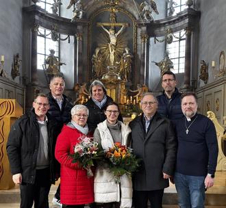 Abschiedsfoto mit dem gesamten Team in der Pfarrkirche Heidenfeld (vorne links Pfarrvikar Benjamin Schimmer, Gudrun Dotzel, Tanja Reichert)