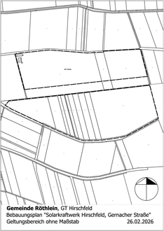 Der Rat der Gemeinde Röthlein hat in seiner öffentlichen Sitzung am 17.03.2026 den Entwurf des Bebauungsplans „Solarkraftwerk Hirschfeld, Gernacher Straße" einschließlich der Begründung und des Umweltberichts in der Fassung vom 17.03.2026 gebilligt und beschlossen, die öffentliche Auslegung nach § 3 Abs. 2 BauGB sowie die Beteiligung der Behörden und der sonstigen Träger öffentlicher Belange nach § 4 Abs. 2 BauGB durchzuführen.