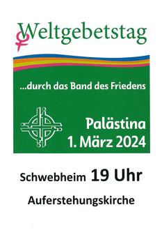 | 19.00 Uhr | Kirche | Weltgebetstag „Palästina – durch das Band des Friedens“Herzliche Einladung an alle! |