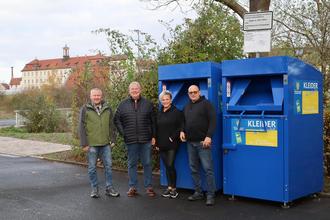 2. Bürgermeister Martin Weth und Beschäftigte der Fa. Striebel Textil bei der Aufstellung der Container am Standort Dorfstr. 32, Heidenfeld