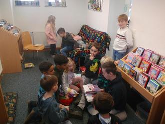 Elias Kühlmann las einige der Geschichten vor und die Kids lauschten gespannt. Er machte eine Praxisstunde in der Bücherei, die er im Rahmen der Firmvorbereitung leisten sollte.
