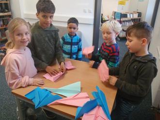 Anschließend ging es zum Praxisteil über: wir wollten noch Papierflieger basteln. Iseyas Götz hatte sich vorbereitet und Probeflieger gebastelt. Er zeigte den Kindern wie sie falten können, um einen schnellen Flieger, einen Segler, oder einen Düsenflieger zu erhalten. Natürlich wurden die Flieger gleich ausprobiert. Eine sehr lebhafte Lese-Bastelstunde……..