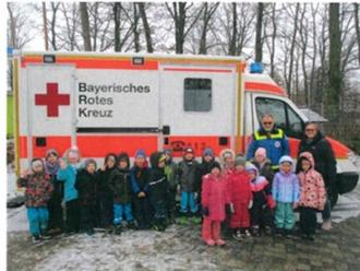 Mitte Januar stand für die „Großen“ des Kindergartens ein spannender Besuch an - zwei Rettungssanitäter, darunter der Hausmeister des Kindergartens Rainer und seine Kollegin Petra kamen mit einem Rettungswagen vom Roten Kreuz in den Kindergarten.