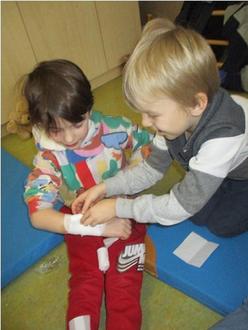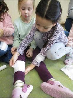 Den Kindern wurde gezeigt, wie sie sich oder einem anderen Verletzten ein Pflaster aufkleben oder einen Verband anlegen können, welche Nummer gewählt werden muss, damit Hilfe kommt und wie man sich im Notfall verhalten sollte.