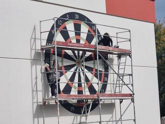 Im ersten Schritt wurde eine Dartscheibe in Originalgröße von den Schülerinnen und Schülern gemessen. Im Anschluss wurden die Maße so vervielfacht, dass ein Außendurchmesser von etwa 4,30 Metern entstand. Um dieses überdimensionale Kunstwerk zu verwirklichen, fertigten die Schüler aus einer Holzlatte einen riesigen Zirkel an, mit welchem die einzelnen Kreise gezogen wurden. Danach wurden die 20 Felder ausgemessen und angezeichnet.