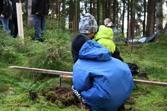 Nach einer Begrüßungsrunde aller Anwesenden und einer Einführung in den Tag, ging es direkt los in den Wald, bepackt mit Pflanzwerkzeug und Jungbäumchen. Am Ziel angekommen, erklärte Bauernfeind den Kindern den Arbeitsvorgang und Kirsch besprach mit den Kindern die Eigenschaften und Sorten der Pflanzen. Es wurden Rotbuchen, Weißtannen und Spitzahorn gepflanzt.