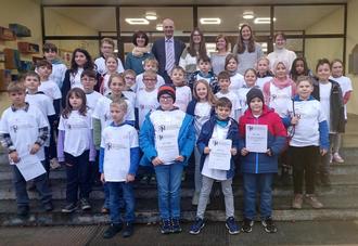 alle Heidenheimer Teilnehmer aus den 15 Landkreis-Grundschulen mit dem verantwortlichem Lehrerteam und Schulrat Franz-Josef Heller