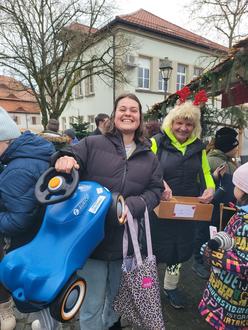 Die glückliche Gewinnerin freut sich über ein Bobby Car.