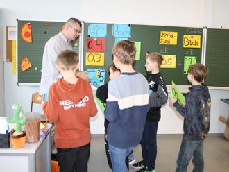 Die Mittelschulklassen hatten mit ihren Lehrkräften attraktive Angebote vorbereitet: Im PC-Raum wartete Herr Schenk in Vertretung von Herrn Wokon mit der 6a. Bei Frau Wanninger-Hippelein konnten die Gäste die Klasse 5a auf Englisch kennenlernen. Bruchrechenaufgaben hatte Herr Behr mit der 7a vorbereitet.