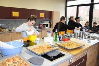 Andere Achtklässler führten unter der Regie von Frau Gebert in die Schulküche ein. Sie hatten vorher fleißig Pizzasemmeln produziert, sodass niemand mit leerem Magen zur nächsten Station ziehen musste.