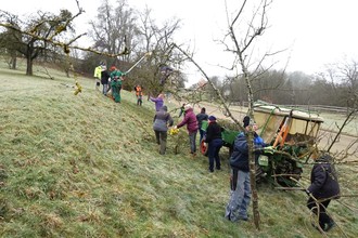 Heute im Jahr 2023 erfolgte am 04.03. schon die 4. Aktion und die Beteiligung war ungebrochen. 35 Helfer des Obst-, Heimat- und Fremdenverkehrsvereins Hohentrüdingen trafen sich um 9:00 Uhr am Feuerwehrhaus. Unter der bewährten Leitung des Landschaftspflegeverbandes Mittelfranken (Frau Friedericke Altenberger LPV-Mittelfranken, Baumpfleger Herrn Erwin Härtfelder und Herrn Johannes Nehmeier) wurde in zwei Gruppen ans Werk gegangen. Die Zusammenarbeit zwischen Baumschneidern, Aufräumern und Abtransporteuren erfolgte routiniert. Alle Hände von Groß und Klein waren willkommen und hinterließen ihre Spuren. Gegen 11:00 Uhr gab es die erste verdiente Stärkung bei Getränken, Brezeln und Kuchen. Wer hat das alles nur gebacken? Da merkt man, dass das Organisieren und Helfen schon viel früher beginnt.