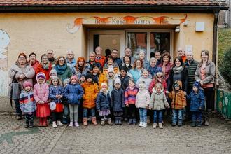 Am 10.03.2023 fotografierte Denise Mayer Fotografie die zahlreich Gekommenen direkt vor dem Eingang des Bergkindergartens. Nicht fehlen durften sowohl die erste Kindergartentante Maria als auch die aktuellen drei Erzieherinnen Yvonne, Evi und Anja und unser Pfarrer Herr Heidecker.