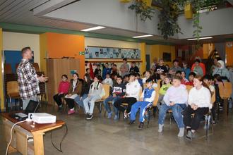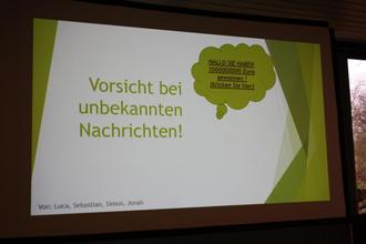 Die Schülerinnen und Schüler der 8. Klasse beschäftigten sich in den vergangenen Wochen mit dem Thema „Verhalten im Netz“. Im Informatikunterricht bei Herrn Wokon gestalteten sie in Gruppen Präsentationen zu den Inhalten „Cybermobbing“, „Rechte im Internet“, „Onlineplattformen“ und „Vorsicht bei unbekannten Nachrichten“. Was zunächst nur für den Unterricht bestimmt war, entpuppte sich jedoch als Idee für eine schulweite Präsentation mit großem Publikum. So waren die Schülerinnen und Schüler eifrig mit der Verbesserung ihrer Fähigkeiten im Umgang mit Powerpoint, als auch mit den dazugehörigen Präsentationsfähigkeiten, wie Gestik und Mimik, am Werk. Einmal auf der großen Bühne zu stehen und einen Vortrag vor mehr als 80 Zuschauern halten, war für die meisten ein besonderes Erlebnis. Zusammenfassend kann man sagen, dass sowohl die anderen Mittelschulklassen als auch die Referenten mit einer interessanten neuen Erfahrung aus diesem Vortrag gehen konnten.