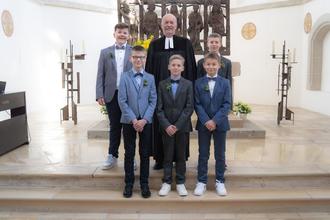 Am Sonntag Quasimodogeniti, dem 7. April, haben Merlin Himml, Jonas Holzinger, Konstantin Jarsetz, Sebastian Laux und Daniel Obel im Münster St. Wunibald in Heidenheim ihre Konfirmation gefeiert: Sie bekannten selbst den Glauben, auf den sie als kleine Kinder getauft worden waren, empfingen das Abendmahl und wurden von Pfarrer Johannes Heidecker und ihren Paten gesegnet.