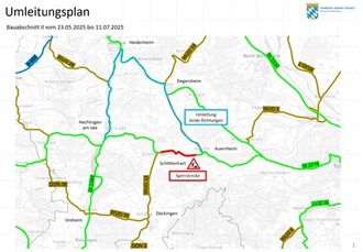 Gleichzeitig beginnt der zweite Bauabschnitt zwischen Schlittenhart und Auernheim, der dafür voll gesperrt wird. In diesem Abschnitt wird die Fahrbahn umfassend instandgesetzt und verstärkt. Die Fertigstellung ist bis Mitte Juli geplant. Während der Arbeiten im zweiten Bauabschnitt bleibt die Umleitung über Degersheim bestehen. Die Kreisstraße WUG 33 in Richtung Döckingen ist ab sofort wieder von Hechlingen aus erreichbar.