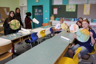 Um bequemer zu sitzen, wird die 6. Klasse unter der Leitung von Frau Salomon noch die passenden Kissen für die Hocker aus alten Landkarten nähen.