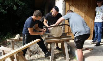 Ein Teil der 9. Klässler sägte, schliff und bohrte fleißig den Vormittag über am Gelände der Zimmerei Beyer, um aus einem fünf Meter langen Fichtenstamm Sitzhocker zu bauen. Diese sollen im Sommerhaus verbleiben, um als Sitzgelegenheiten für den außerschulischen Unterricht dort zu dienen.