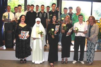 Die Schulabgänger mit Rektorin Kirchmeier (v.r.) und Klassenlehrerin Schneider-Ebert (2.Reihe rechts)