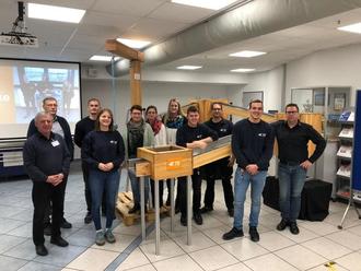 Das Bild zeigt die Projektgruppe zusammen mit ihren Ausbildern bei der Übergabe des Spielgerätes an die Kindergartenleitung und die Vorsitzenden des Diakonievereins Mönchsroth e.V.