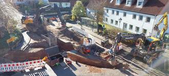 Immer größere Löcher tun sich bei der Kanalbaumaßnahme in der Gardestraße auf. Im aktuellen Bauabschnitt wir der Kanal von der Hauptstraße bis zur Einmündung in die Schmiedstraße neu gebaut. Dadurch wird der bisher bestehende Kanal, der unterdimensioniert ist, größere Schäden aufweist und zudem über Privatgrund verlegt ist, aufgegeben. Auch die Hausanschlüsse in diesem Bereich müssen neu verlegt werden.
