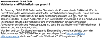 Am Sonntag, 08.03.2026 findet in der Gemeinde die Kommunalwahl 2026 statt. Für die Durchführung der Wahl werden Wahlhelfer und Wahlhelferinnen gesucht. Diese sind am Wahltag jeweils von 08:00 Uhr bis zum Auszählungsschluss und ggf. noch am darauffolgenden Tag zum Auszählen in den Wahllokalen im Einsatz. Für die Ausübung des Ehrenamtes erhalten die Wahlhelfer und Wahlhelferinnen eine angemessene Aufwandsentschädigung. Voraussetzung ist, dass die Wahlhelfer und Wahlhelferinnen 18 Jahre alt und wahlberechtigt sind.