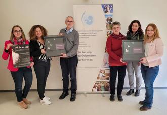Präsentieren die Schmetterlingsbriefkästen (von links): Tamara Stimpfle und Julia Fälschle von der Schwangerschaftsberatung am Gesundheitsamt Dinkelsbühl, Pfarrer Joachim Pollithy von der Katholischen Kirchengemeinde Dinkelsbühl, Diakonin Claudia Grunwald von der Evangelischen Kirchengemeinde Dinkelsbühl, Ursula Fetzer von der Selbsthilfegruppe „Verwaiste Eltern“ Dinkelsbühl sowie Martina Hartmann von der Schwangerschaftsberatung am Gesundheitsamt Dinkelsbühl