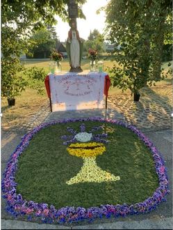 An Fronleichnam möchten wir neben allen Pfarreiangehörigen auch wieder alle Vereine mit ihren Fahnen zur Prozession einladen. Auch bitten wir die Anwohner des Prozessionsweges wieder um Schmückung der Straßen und Häuser mit Fahnen und Blumen.
