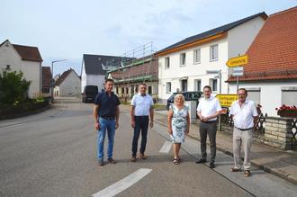 Ortstermin zum Start der Baumaßnahmen. (v.l.nach r. Hr. Ganzenmüller, Fa. Heuchel, Hr. Kriegler, Straßenbauamt, Bürgermeisterin Stumpf, Landrat Dr. Ludwig, Herr Heller, Ing. Büro)