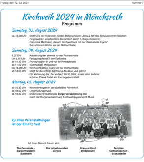 | ca. | 19.30 Uhr | Eröffnung der Kirchweih mit den Böllerschützen „Berg & Tal“ des Schützenverein Stödtlen Regelsweiler, anschließend Bieranstich durch 1. Bürgermeisterin Franziska Mattmann, danach Kirchweihtanz mit der "Blaskapelle Eigner" |