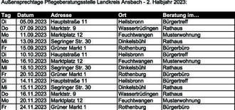 Die Pflegeberatungsstelle des Landkreises Ansbach führt im 2. Halbjahr 2023 wieder eine kostenlose, individuelle, trägerunabhängige Pflegeberatung für Pflegebedürftige und deren Angehörigen durch.