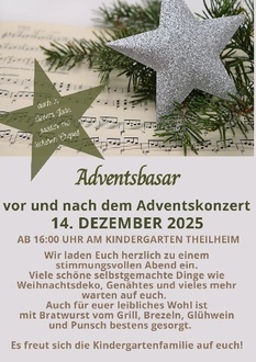 Unter dem Motto „Dezemberträume“ möchten wir Sie mit ausgewählten Texten und stimmungsvoller Musik auf die bevorstehende „stille Zeit“ einstimmen und einen Funken Vorfreude auf das Weihnachtsfest entzünden. Der Musikverein wird dabei wieder vom Frauenchor des Gesangsvereins unterstützt. Nach dem Konzert erwartet Sie wie immer ein kleiner Essens- und Glühweinstand vom Kindergarten Theilheim sowie ein Adventsbasar mit Selbstgemachtem.