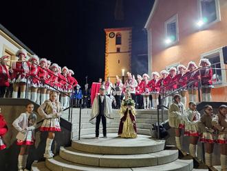 Die Prinzenpaare mit Garde und Elferrat übernehmen das Rathaus und stellen sich vor.