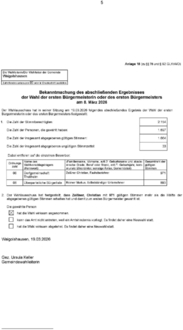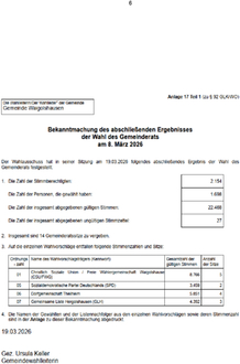 | • | Die Gemeindewahlleiterin Ursula Keller resümierte den sehr gut organisierten Ablauf der Wahlauszählung vom 08.03.2026 und bedankte sich bei allen Wahlvorstandsmitgliedern und der Verwaltung für den Einsatz und den reibungslosen Ablauf. Zudem berichtete sie von der erfolgten Sitzung des Gemeindewahlausschusses, bei dem die Wahl des Bürgermeisters und der Gemeinderatsmitglieder geprüft und bestätigt wurde. Angemerkt wurde auch, dass die Ausweisung des Raumes der Kegelbahn im FZZ als Wahllokal für den Wahlbezirk Waigolshausen anscheinend zu klein und die Anzahl der Wahlkabinen zu gering gewesen sei. Dies hat gelegentlich zu längeren Wartezeiten bei den Wählern geführt. Seitens der Verwaltung wurde dies aufgenommen und wird zukünftig berücksichtigt. |