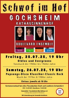 Gochsheim lädt ein zum Sommer-Highlight: Am Freitag, den 25. und Samstag, den 26. Juli 2025 verwandelt sich der Rathausinnenhof in eine stimmungsvolle Open-Air-Bühne. Beim „Schwof im Hof“ erwartet alle Musik- und Tanzbegeisterten ein unvergessliches Wochenende voller Live-Musik und guter Laune.