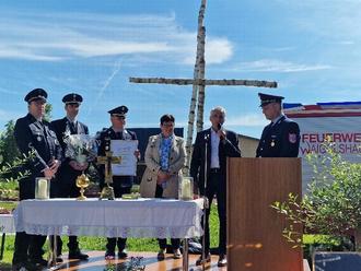 Im Anschluss an den Feldgottesdienst, der unter freiem Himmel vor dem Feuerwehrhaus gefeiert wurde, ergriff der Vorsitzende des Waigolshäuser Feuerwehrvereins Wolfgang Strobel das Wort und bat Walter Zeißner, gemeinsam mit seiner Frau, auf die Bühne.