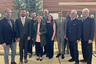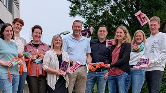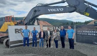 Andreas Manger, Hubert Bühner, beide Mitarbeiter in Waldberg, Jennifer Triest, Geschäftsleiterin, Reinhold Stahl, Verbandsvorsitzender, Sonja Reubelt Bürgermeisterin Sandberg, Alfred Eusemann, Betriebsleiter, Julian Lembach, ebenfalls Mitarbeiter in Waldberg
