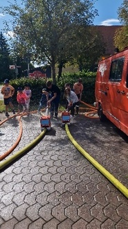 Nach einer Einführung vom stellvertretenden Kommandant Thomas Staab zur Meldekette und Erster Hilfe stand der spielerische Teil auf dem Programm. Unter dem Motto „Du der kleine Lebensretter, du der kleine Feuerwehrmann“ sorgten Manuel und Lisa Ehni für Action: Beim Zielspritzen mit der Kübelspritze und den Feuerwehrautos auf dem Schlauch entlang rasen lassen konnten die Kinder ihr Geschick beweisen - und hatten dabei jede Menge Spaß.