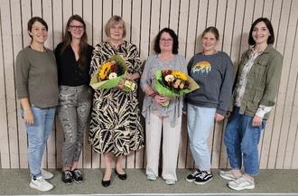 Das Foto zeigt die bisherigen Trainerinnen Ingrid Ziegler und Anita Scheck (beide mit Blumen), sowie die Gymnastik Abteilungsleiterin Lena Keller (links) mit den neuen Trainerinnen Janina Neder (daneben), Mareike Meister (2.von rechts) und Irina Brehm.