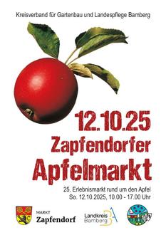 Der Apfel ist nicht nur ein gesundes Obst, er prägt auch unsere Kultur und unsere Landschaft. Um dem traditionellen Streuobst-Anbau in der Region Bamberg eine Plattform zu bieten, veranstaltet der Kreisverband für Gartenbau und Landespflege Bamberg alljährlich am 2. Sonntag im Oktober einen großen Apfelmarkt, dieses Jahr bereits zum 25. Mal. Gastgeber des Jubiläums-Apfelmarktes ist Zapfendorf. Der Markt findet am Sonntag, den 12. Oktober von 10:00 bis 17:00 Uhr im Ortskern von Zapfendorf statt.