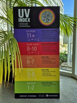 Die auffälligen Tafeln mit integriertem QR-Code machen sichtbar, wie stark die UV-Strahlung an einem Tag ist, und geben gleichzeitig wichtige Hinweise zu empfohlenen Schutzmaßnahmen.