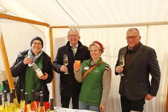 Verkaufsstand des Kreisverbands für Gartenbau und Landespflege Bamberg: v. l. Kreisfachberaterin Claudia Kühnel, 1. Vorstand Landrat Johann Kalb, Kreisfachberaterin Alexandra Klemisch, 2. Vorstand Rainer Giel – stoßen mit Apfel- u. Birnensecco aus dem Obst von eigenen Streuobstwiesen an.
