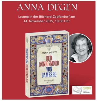 Am Freitag, den 14. November 2025, lädt die Bücherei Zapfendorf zu einem besonderen literarischen Erlebnis ein: Die Autorin Anna Degen (besser bekannt als Karin Dengler-Schreiber) präsentiert ihren mitreißenden historischen Roman „Der Königsmord von Bamberg“.