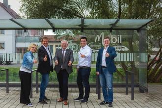 v.l.n.r.: Thea Schellakowsky-Weinsheimer (Fachbereich Mobilität), Markus Hammrich (Fachbereichsleiter Mobilität), Landrat Johann Kalb (Landkreis Bamberg), 1. Bürgermeister Jonas Merzbacher (Gundelsheim), 1. Bürgermeister Michael Senger (Zapfendorf)