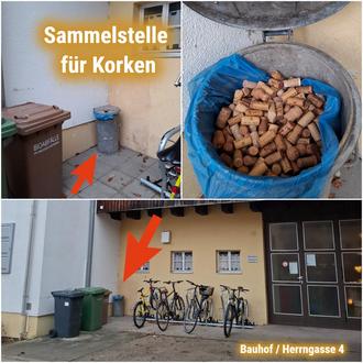 Tatsächlich befindet sich eine Sammelstelle in der Nähe des Eingangs zum gemeindlichen Bauhof (Herrngasse 4, 96199 Zapfendorf). Es handelt sich um eine silberfarbene Abfalltonne in der Ecke zwischen den Mülltonnen und dem Fahrradständer. Gerne können dort Korken im Behälter abgelegt werden.