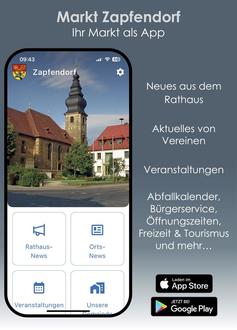 | 1. | Gehen Sie in den Apple-App-Store (iOS) oder in den Google Play-Store (Android) und suchen Sie im Store nach „Zapfendorf“. Es wird Ihnen eine App mit dem Namen „Markt Zapfendorf“ angezeigt (das Logo entspricht dem Gemeindewappen) und laden Sie die App kostenlos herunter. | |