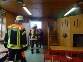 Zusammen mit der Feuerwehr übten die Kinder und Mitarbeiter den Fluchtweg aus dem Gebäude. Am Sammelplatz angekommen bekamen alle nochmals wichtige Tipps, was bei einem Brandfall zu beachten ist.