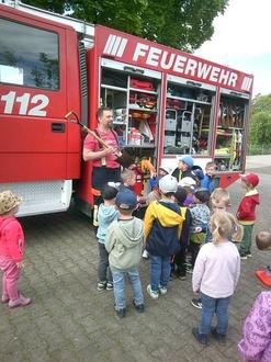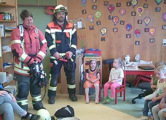 Was machen wir, wenn es brennt? Welche Nummer müssen wir anrufen?,… diese und viele weiteren Fragen stellten die Kinder der Feuerwehrfrau und den Feuerwehrmännern. Jeweils zwei Feuerwehrleute kamen in voller Montur in die Gruppen. Gespannt und anfangs noch etwas zurückhaltend beobachteten die Kinder die Ausführungen der Feuerwehrler. Doch das Interesse der Kids war groß, schon alleine die Schutzkleidung mit Helm, Jacke, Hose, Schuhe ergab viel Gesprächsstoff. Die Atemschutzmaske und die Sauerstoffflasche wollten die Kinder selbst einmal ausprobieren – ganz schön schwer. Plötzlich piepste der Rauchmelder. Was tun? Alarm! Alle müssen raus. In dieser praktischen Übung liefen die Kinder und Erzieherinnen in den Garten zur Sammelstelle. Alles hat gut geklappt. Die Feuerwehrautos aus Mindelaltheim und Dürrlauingen standen schon bereit und wurden von den Kindern sogleich entdeckt. Mit viel Geduld und Ausdauer erklärten die Feuerwehrleute die Ausrüstung der Autos. Natürlich durfte jeder noch probesitzen. Auch die Tore des Feuerwehrhauses waren geöffnet. Absauganlage, Schlauchturm, Schutzkleidung waren dort zu finden. Eine ganz besondere Aufregung entstand beim „echten“ Spritzen mit dem Schlauch. Fasziniert staunten die Kinder wie hoch und weit so ein Wasserstrahl reicht. Wir bedanken uns recht herzlich bei der Feuerwehr, die mit viel Freude und Engagement uns einen supertollen Vormittag beschert haben.