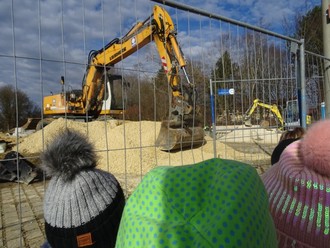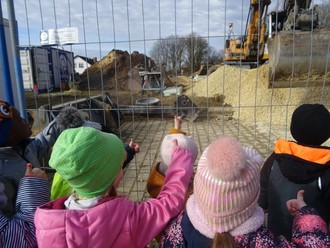 Auf unserer Baustelle ist immer was los. Neugierig verfolgen die Kinder der Kita Zwergenland, wie ihr neuer Kindergarten gebaut wird. Immer wieder besuchen sie mit ihren Erzieherinnen die Baustelle und staunen, wie die Arbeiten voran gehen. Alle sind schon ganz gespannt, wie der neue Kindergarten wohl aussehen wird und was es da für neue Räume, Spielsachen und Spielgeräte geben wird.